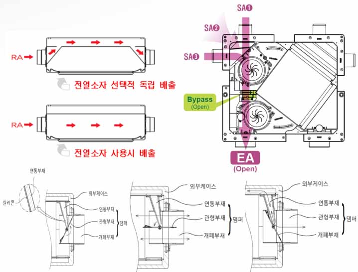 신청기술은 열교환이 가능한 개량형 환기장치 시스템으로 배기시 선택적 전열소자의 사용이 가능하며, 공기 유입시 자체적 보호를 위한 온도결로방지체와 공기정화필터 및 발포프로필렌 소재를 통하여 경량화 및 내구성이 확보된 환경적 기술이다.