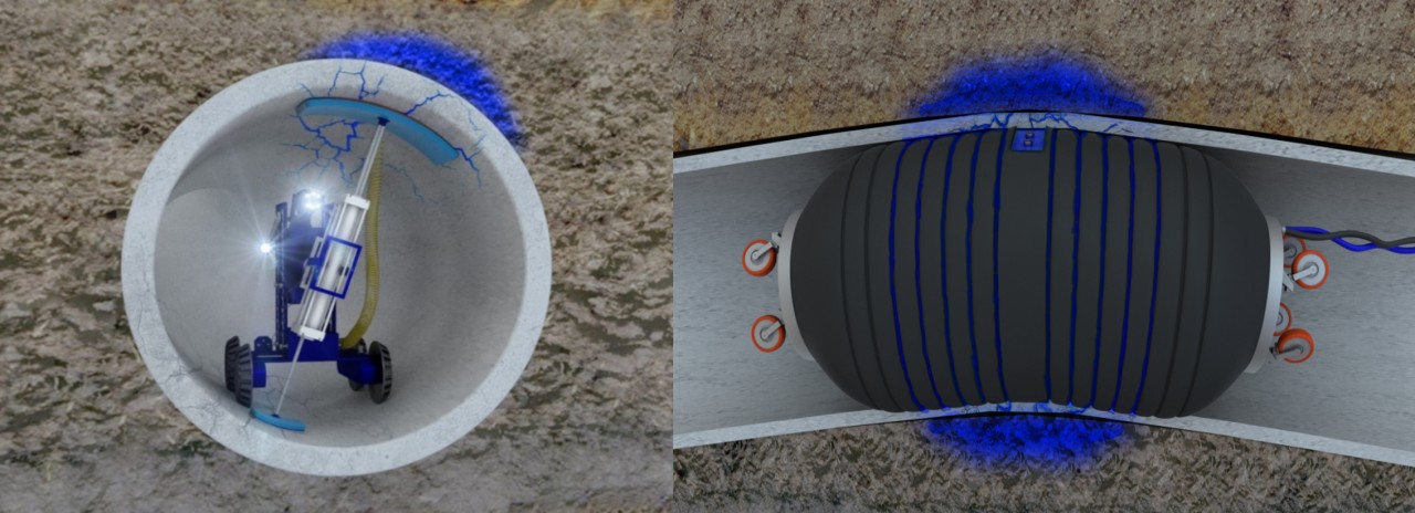 신청기술은 충진 지수용 보수로봇과 굴절식 팩커를 개발 적용하여 소형ㆍ중형ㆍ대형의 직선관, 분기관, 이음관, 굴절관, 맨홀 연결부 파손 및 균열 발생부위에 충진 지수용 보수재를 주입함으로 침출수와 침입수의 누수차단, 외부 겔층 형성을 통한 토양유실 방지 효과를 실현하여 수밀적, 기밀적, 구조적 안정성과 작업자의 안전성을 확보한 지수 충진 하수관거 비굴착 부분 보수기술